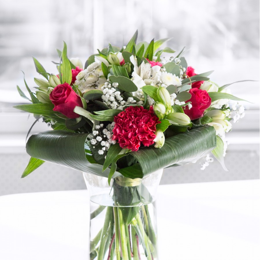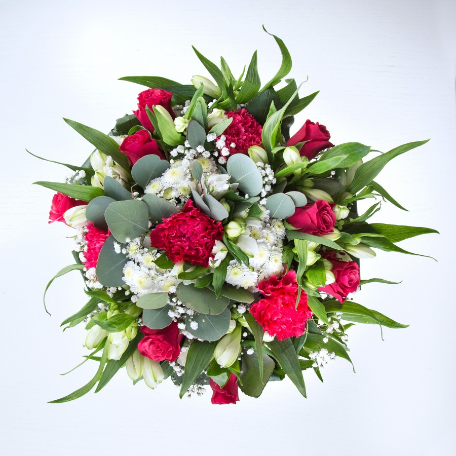 Immerse yourself in the exquisite beauty of our Elegant Blossom Bouquet. This stunning arrangement features a harmonious blend of vibrant red roses, delicate white chrysanthemums, and lush carnations, thoughtfully combined with graceful gypsophila and fresh white alstroemeria.